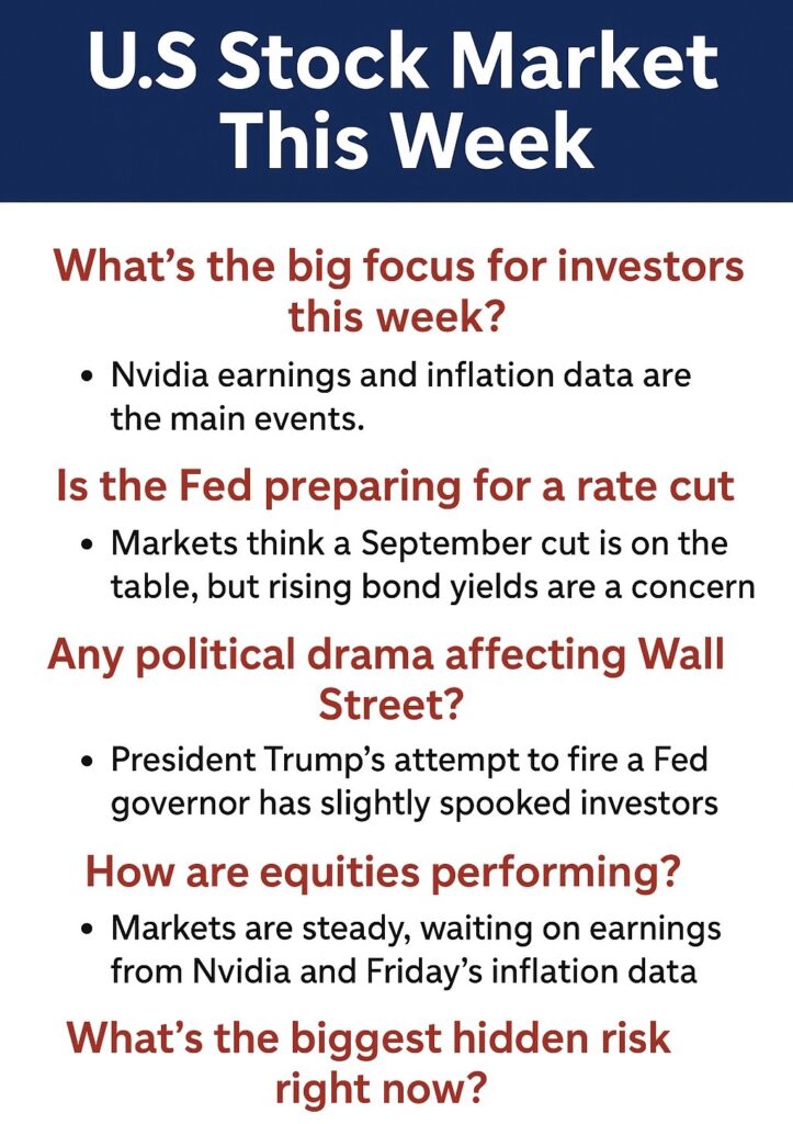 Nvidia earnings: A strong report could fuel tech and AI stocks; a weak one could spark volatility. PCE inflation data: If inflation cools, the Fed may lean toward cutting rates next month positive for stocks. Bond yields: If yields keep rising, equities may struggle, so diversification is key. Political moves: Any fresh tussle over Fed independence could create jitters, even if short-lived. Sector opportunities: Broader market participation suggests looking beyond just tech cyclical and healthcare sectors are showing strength.